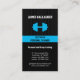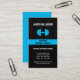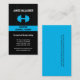 Um cartão de visita gràfica corajoso para um instrutor, um proprietário do gym ou um treinador pessoal. Uma silhueta de um dumbbell azul brilhante está para fora contra o fundo preto rico das riscas. Seu título ou nome da empresa sentam-se no bar azul impressionante embaixo com sua informações de contacto abaixo contra o preto rico. Adicione toda a informação extra na atenção-obtenção traseiro. Disponível em cores alternativas com produtos de harmonização.