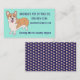 Estas cartões de visitas simples e fáceis de ler são perfeitas para promover o seu próprio animal de estimação sentado, a andar de cão, a aliciar cães ou a treinar cães. Estes cartões apresentam uma ilustração de um lindo Cão Pembroke Welsh Corgi contra um fundo verde-menta em negrito com campos de modelo para que você adicione seu nome de empresa, número de telefone, e-mail e slogan. Precisa adicionar mais informações a estas placas? Basta selecionar a opção "Personalizar" para adicionar texto adicional. As costas destas cartões de visitas têm um fundo marinho azul coordenado com um padrão inteiro de Corgi.
