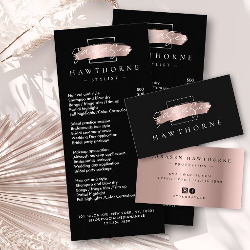 Cartão De Visita Pincel Chic Traço Faux Rosa Dourado e negro Elegan