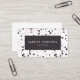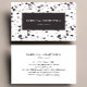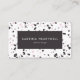 A modern business card design featuring a trendy terrazzo pattern in shades of charcoal gray, pink and lilac on a white background. Personalize it with your name and title in white text on charcoal gray rectangle. Add your name, title and contact details on the reverse side.