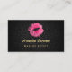 Um glamouroso cartão de visita de maquiagem rosa e preto com texto dourado que apresenta um impressão de beijo com brilho labial cor-de-rosa quente contra um fundo impressão de chita preto. Personalize acrescentando o nome do cosmetólogo ou esteticista. Impressão plana, não metálica ou refletora.