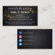 Fundo preto, textos mínimos com rajadas de ouro. Os ícones das mídias sociais são apresentados no verso. Este design é adequado para qualquer indústria, unisex e na moda.