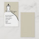 Uma cartão de visita para planejadores de casamento com uma ilustração de um vestido de noiva branco de cheio sem fita em uma forma de vestido. Cor de fundo e texto personalizáveis.