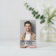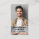 Cartão de visita moderno com sua foto sobreposta com seu nome e título em tipografia ousada em uma faixa metálica esfregada de prata falsa. No verso, adicione suas informações de contato e insira um endereço URl para criar um código QR digitalizável conectado ao seu site, portfólio, perfil de mídia social ou qualquer outra plataforma que mostre seu trabalho.