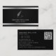 Na moda prata e cartão de visita móvel preto têm uma colina prateada sobre um fundo listrado de sub-le preto com bares de folha prateada. Adicione seus detalhes de negócios notários e o código QR no verso.