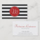 Estes chique & cartão de visita elegante caracterizam um fundo listrado horizontal preto e branco clássico. Sobre o fundo é um círculo decorativo vermelho brilhante com um monograma branco customizável. A parte traseira do cartão é branco simples com sala para seus detalhes do nome, da posição & do contato. Este é os cartões de visitas ideais para indivíduos dos trabalhos em rede, salões de beleza & termas, boutiques, maquilhadores e profissionais da indústria da moda.