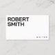 Um cartão de visita branco e preto moderno, simples, com espaço para seu nome, profissão, identificador de mídia social, site, endereço de correspondência e número de telefone.