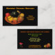 Clientes de Desenhar para a sua mercearia orgânica com este cartão de visita vivo que apresenta uma tigela de frutas. Uma maçã, um abacate, peras e bananas numa taça laranja contra fundo preto criam uma linda frente artística. As costas têm peras, rosas e texto específico. Personalize todo o texto para ajustado da sua loja.
