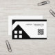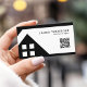 This modern real estate agent business card features a clean black and white layout with a bold geometric home design. The minimal composition creates a strong professional impression while keeping the focus on your name and contact details. A built-in QR code allows clients to quickly access your listings, website, or contact information with a simple scan.