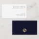 Faça uma impressão duradoura com nossos Cartões de visitas Profissionais Simples e Elegantes apresentando tipografia clássica em um fundo branco limpo. A parte traseira apresenta um logotipo emblema geométrico dourado impressionante sobre um fundo azul-marinho elegante. Perfeito para qualquer profissional de negócios que queira criar uma impressão duradoura.