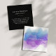 Cartões de visitas de aquarela em um formato quadrado exclusivo apresentam seu nome ou nome de empresa em camadas em uma ilustração de borrão de tinta florescente em tons de entalhe de azul indigo e roxo violeta. Adicione as informações de contato do cheio ao fundo em branco a preto.