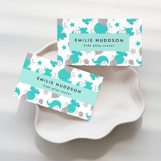 Cartão De Visita Quadrado Elefantes Azuis, Kids Play Center, Centro de Ativi