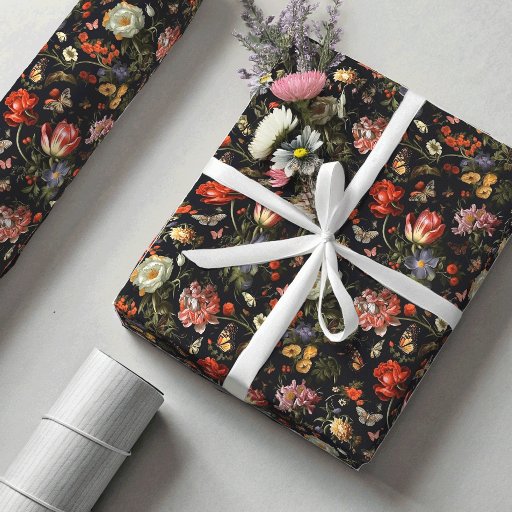 Colagem botânica elegante, com colagem de flores, insetos e borboletas em estilo barroco e fundo preto veludo.