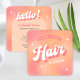 Cartões de visitas modernos de cabeleireiro com cor de pêssego pastel e fundo de gradiente rosa e fontes do estilo de ranhura retrô que leem 'Cabelo' e 'Olá'. Esses cartões de visitas de cabelos na moda incluem espaço para seu nome, serviços, informações de mídia social e detalhes de contato, uma maneira fácil de fazer cartões de contato personalizados para seu salão de cabelo ou boutique de cabelo.