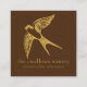 O moderno quadrado cartão de visita apresenta a ilustração de pássaros com vintage dourada sobre fundo castanho escuro com texto contemporâneo na frente e código QR personalizável para o seu website ou mídia social no verso.