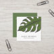 Cartão de visita de praça tropical apresentando um design simples e moderno com uma grande folha de palma verde junto com seu nome e título, sobre um fundo branco. A parte de trás tem as informações de contato em branco sobre uma sombra de verde correspondente.