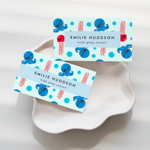 Cartões de visitas bonitos, divertidos e adoráveis com polvos piratas e águas-vivas. Design moderno e moderno, perfeito para crianças que brincam com centros de brincadeira, parques de brincadeiras, centros de atividades, assistência à criança, assistência ao dia, babás e babás.