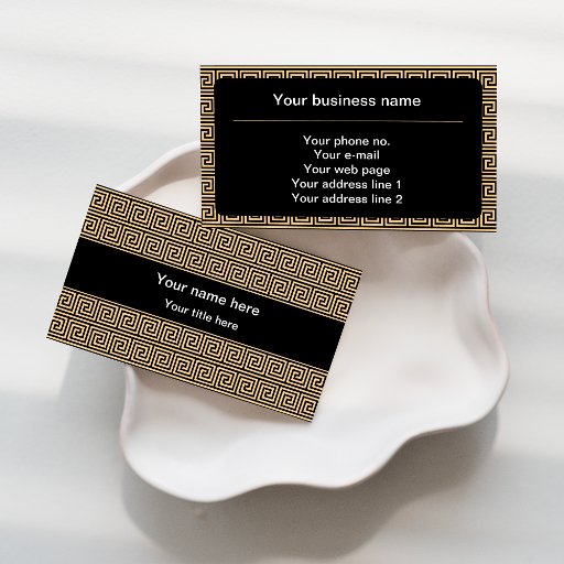 Cartões de visitas elegantes, na moda e sofisticados com quadrados gregos com padrão-chave meander em cor castanha e preta. Design moderno e moderno, perfeito para o amante mediterrânico.