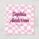 Stand out with this fun and trendy square business card featuring a pink wavy checkerboard pattern and bold script name. The playful yet stylish design makes networking memorable and helps your brand feel modern and friendly. The back of the card includes a customizable QR code, allowing clients to instantly access your website, booking link, portfolio, or social media with one quick scan.