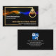 Uma fiação de circuito elétrico dourada é acionada por um raio que se rompe pelo espaço, ligando a lâmpada. No topo estão o seu nome prestigioso e o título do cargo, com o nome comercial e os detalhes de contato próximos à base.