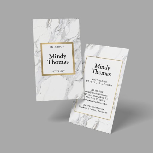 Um fundo branco marmoreado moderno e elegante cria um visual luxo nestes cartões de visitas de designer. Seu nome ou nome comercial é elegantemente estirado em uma caixa falso de ouro rosa para um logotipo impressionante. Adicione seu título, site ou texto descritivo ao redor das bordas ou deixe o vazio. Este design de placa de lado duplo permite uma ampla sala na parte traseira para suas informações de contato e detalhes. Arte e design © 1201AM CREATIVE