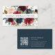 Cartões de visitas florais de aquarelas quicas apresentam seu nome ou nome de sua empresa flanqueado por uma borda superior e inferior de flores pintadas em tons de joia de burgundy marsala, marinho azul e pincel rosa, com folhagem botânica verde de eucalipto. Adicione as informações de contato do seu cheio à parte traseira em branco no marinho azul e personalize o código QR para facilitar a conexão dos clientes. Uma escolha única e elegante para floristas, planejadores de eventos ou qualquer negócio.