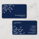 Um modelo de cartão de negócios na moda moderno com um motivo abstrato composto por linhas vetoriais cada uma terminando em um ponto circular sólido, inspirado em ilustrações científicas de coisas como a faixa de partículas, embora pudesse representar muitas coisas ou simplesmente agir como uma decoração atraente. Nome da empresa e tipo de negócio na frente, no canto inferior direito. Nome e outros dados de contato no verso com o mesmo motivo que o usado na frente, exceto virado e colocado no canto inferior esquerdo, criando um design atraente, variado mas consistente, em ambos os lados.