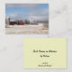 Este cartão comercial de artista apresenta uma encantadora cena rural de inverno. Camarões vermelhos e silo são cercados por campos brancos nevados com apenas a bolha de feno cortado e um céu azul pontilhado com nuvens brancas lisas.