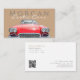 Um cartão de visita inteligente com carro esportivo vermelho com nome e ocupação em um fundo bronzeado com cinzas e texto branco. A parte traseira tem um fundo branco com texto em tons e preto com código QR e informações de contato.
