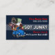 Tem um caminhão e quer ganhar dinheiro extra ou começar um negócio? Muitas pessoas não têm como se livrar ou mover itens grandes, então se você anunciar que você tem um caminhão, alguns músculos e é profissional, você tem todos os fazeres de um negócio de excelentes. Este cartão diz "profissional, mas simpático e confiável". Ilustração de cara amigável em caminhão de coleta de safra azul carregado com móveis e lixo. O texto e as cores são personalizáveis.