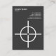 Um modelo de cartão de negócios com um círculo vago ou símbolo 'O' na frente. Nome da empresa, tipo de negócio e endereço na frente com nome, cargo, telefone, web e endereços de e-mail no verso, com um layout semelhante em um fundo de cinza com uma repetição do símbolo frontal em branco. Este cartão também pode ser mais personalizado.