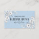 cartões de visitas florais azuis para o seu negócio de sabão e vela! O design apresenta rosas brancas em um plano de fundo azul com texto de carvão. Adicione seu nome de empresa, oferta de promocional e páginas de mídia social e marque as costas para realmente fazer a bola rodar em sua empresa.