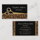 Atrair novos clientes e clientes com esses cartões de visitas de salão de cabelos em moda e na moda para cabelos profissionais estilhaçados com uma impressão-leopardo marrom moderna e moderna e embelezada por um par de tesouras de corte de cabelo em ouro. Essas elegantes cartões de visitas de impressão de animais de luxo podem ser personalizadas acrescentando o nome do belicista ou cabeleireiro e seu salão ou butique de beleza. O gradiente dourado é uma imagem impressa, não metálica e o padrão do pelo não é texturizado.