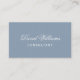 Um cartão de visita simples com uma cor moderna: azul empoeirado. O fundo é azul empoeirado, o texto é branco. Na frente, o nome é escrito em um roteiro caligráfico elegante. O resto do texto está em bonés.