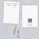 Este elegante cartão de visita de exibição de joias preto e branco com script de assinatura, é ideal para exibir suas joias feitas à mão em sua pequena empresa. Uma maneira simples e profissional de apresentar sua empresa. Código QR, ícones das mídias sociais incluídos no design deste cartão de visita de brinco para exibição para uso. Personalize seus detalhes para criar seu próprio cartão de visita exclusivo.