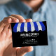 Aumente sua empresa de serviços de aviso com um design de cartão de visita cativante. Este cartão de visita apresenta uma ilustração azul e branca e cinza de uma advertência contra um fundo preto escuro chic, com detalhes chave na fonte serif em branco A parte traseira do cartão fornece espaço para uma lista abrangente de serviços. As cores azul e branca podem ser alteradas!