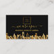 Uma cartão de visita para promover a reabertura da sua empresa após o 19° Programa Covid, o vírus da coroa. Fundo negro e horizonte da abstrato em ouro falso. Personalize e adicione o logotipo e o nome da sua empresa: Texto à frente: Estamos abertos. Voltar: seu texto, informação.