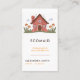 Um cartão de visita moderno, simples e elegante para um negócio de serviços de limpeza e manutenção doméstica. Ele apresenta uma ilustração retróquica de uma casa fofa e flores brancas, em um esquema de cor rosa, verde e amarelo empoeirado. Este cartão de visita é perfeito para serviços de limpeza de casas, manutenção de casa, serviços de empregada, serviços de limpeza ou limpeza estofada.