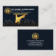 Um cobrir azul escuro apresenta uma silhueta de horizonte com um design de prato de garçom dourado. Acima da placa de serviço está um logotipo de cutelaria dourada que você pode usar junto com o nome da empresa, uma legenda de slogan para divulgar seus serviços e os detalhes de contato. ; Você pode mudar os comentários de legenda para o slogan para adequá-los às suas necessidades de serviço. No verso, no topo está o logotipo dourado seguido do seu nome comercial, dos dados de contato e de um slogan. Este é um cartão de excelente para temas de comida.
