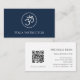 Código QR Yoga Instrutor cartão de visita, com um design de símbolo om branco com um fundo azul marinho. Com letras brancas e pretas, você pode adicionar suas próprias informações. Você também adiciona seu endereço Web ao campo de código QR.Excelente para promover seu estúdio de yoga ou negócios de malhação.