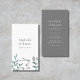 This simple modern garden greenery business card designs features a watercolor damselfly/dragonfly in shades of blue and green with iridescent wings. It is resting on a simple arrangement of natural watercolor garden greenery in shades of green, blue, grey and brown with a white background. The back is a solid grey that matches the front text.