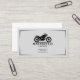 A professional business card with subtle gray accent lines framing and featuring a sleek black motorcycle silhouette rendered in a minimalist style with chrome accents and sits prominently in the upper portion. It could also be used for automotive or motorcycle-related services (sales, shop, repair, motorcycle school, etc).