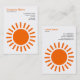 Um modelo de cartão de negócios com símbolo do Sol. Nome da empresa, tipo de negócio e endereço na frente com nome, cargo, telefonia, web e endereços de e-mail no verso, com o mesmo layout.