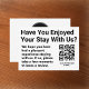 Você gostou da sua estadia conosco? Incentivar os clientes a deixar uma revisão. A mensagem diz: "Esperamos que tenha tido uma experiência agradável conosco. Em caso afirmativo, peço-lhe que aguarde alguns instantes para deixar uma revisão". Altere o texto para atender às suas necessidades. Altere o link Código QR para o link que leva à sua própria página de revisões. Se o Google for consultado, consulte: https://tinyurl.com/5ydtb22k