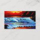 Pintura de ondas caindo na costa com um pôr do sol vermelho e laranja.
