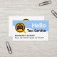 O cobrir apresenta uma camada de trapézio azul e branca. No topo está a legenda "HELLO", que você pode mudar ao lado do nome de negócios "Serviço de táxi". À esquerda deste é um logotipo amarelo de carro de táxi (feito em uma caixa de fala) que você pode usar. Abaixo da base está seu nome prestigiado e os detalhes de contato. No verso, em cobrir branco, no topo está o logotipo amarelo do táxi, seguido do nome da empresa e dos dados de contato. Uma placa de na moda de excelente para todos, especialmente para as empresas de táxi e chofer. #taxi #taxidriver #taxiservice #driver #privatehiredriver #driverforhire #rideshare #designaddriver #limo #chauffeur #zazzlemade