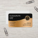 Modelo de cartão de negócios clássico de design imobiliário em preto-e-branco. Projetado com emblema de casa de aparência superior e fundo dourado apresentado em estoque de cartão de visita de canto arredondado. Criado para Realtor, Broker, empresa de títulos ou agência de imóveis.