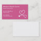 Cartões de visitas médicos com tema de saúde feminina cor-de-rosa, desenhados com um gráfico estetoscópio único em forma cardíaca e texto que você pode personalizar online para um Doutor em Oncologia, OBGYN, clínica feminina e de bem-estar, ou hospital.
