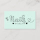 Esse cartão de visita elegante e simples é perfeito para qualquer técnico de pregos independente ou de salão. Apresenta uma tipografia bonito e bonita escrita à mão com a palavra "Unhas", ao lado de pequenos corações doces sobre um fundo verde pastel de menta. No verso estão todos os seus detalhes e informações de mídias sociais. É minimalista, feminino, única e moderna; a design perfeita para comercializar seus serviços. ***NOTA DE DESIGN IMPORTANTE: Para qualquer solicitação de design personalizada, como solicitações de correspondência de produtos, alterações de cor, mudanças de posicionamento ou qualquer outra solicitação de alteração, clique no botão "MENSAGEM" ou envie um e-mail ao designer diretamente em lafemme.art@gmail.com. Você pode até enviar um e-mail para ela solicitando um design completamente personalizado e novo.