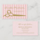 Cartões de visitas de cabelos cor-de-rosa-chico e dourado e salão de beleza para o cabeleireiro profissional com um par de tesouras de corte de cabelo dourado contra fundo listrado na vertical da rosa claro. Esta design é perfeita para anunciar suas habilidades como um profissional de cabelos estilista ou um especialista em beleza.